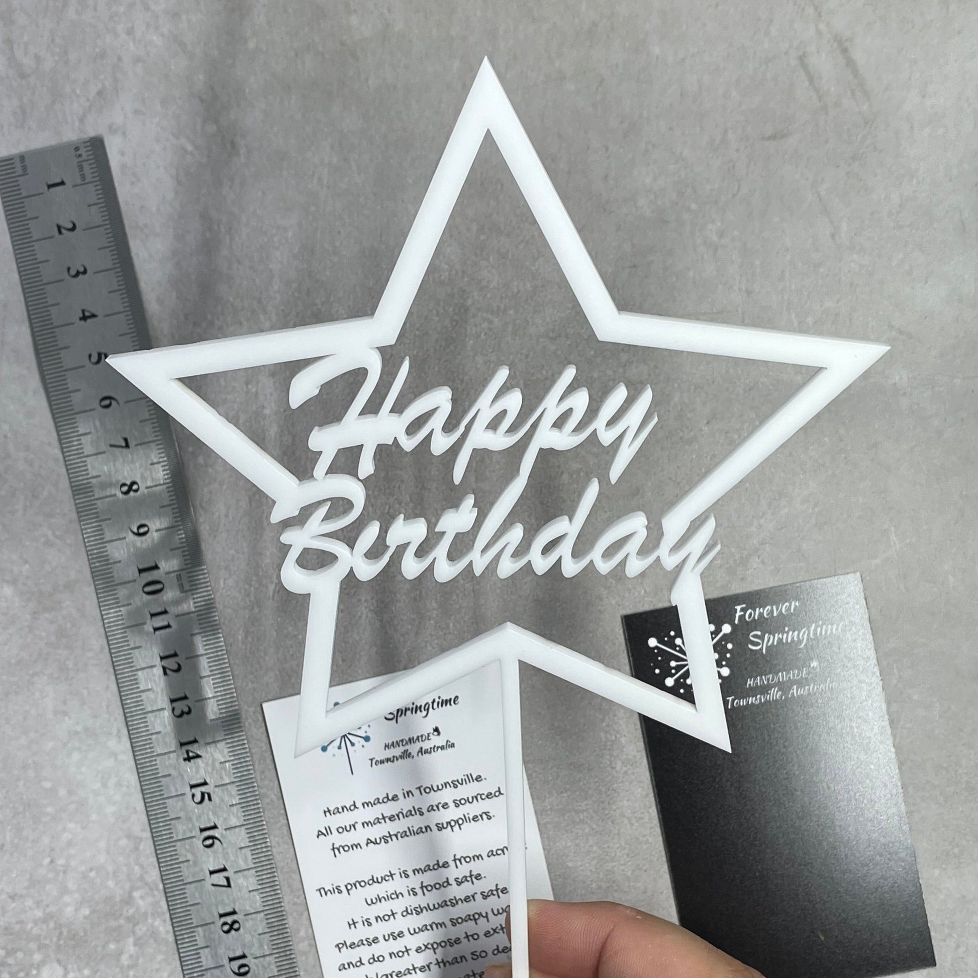 The topper is made from food safe acrylic on a laser at my home in Townsville. The items are food safe. They are not dishwasher safe. Please use warm soapy water only. Please do not expose to extreme heat (greater than 50 degrees Celsius) as the item may become irreparably damaged. They are not suitable for children under 6 years old.