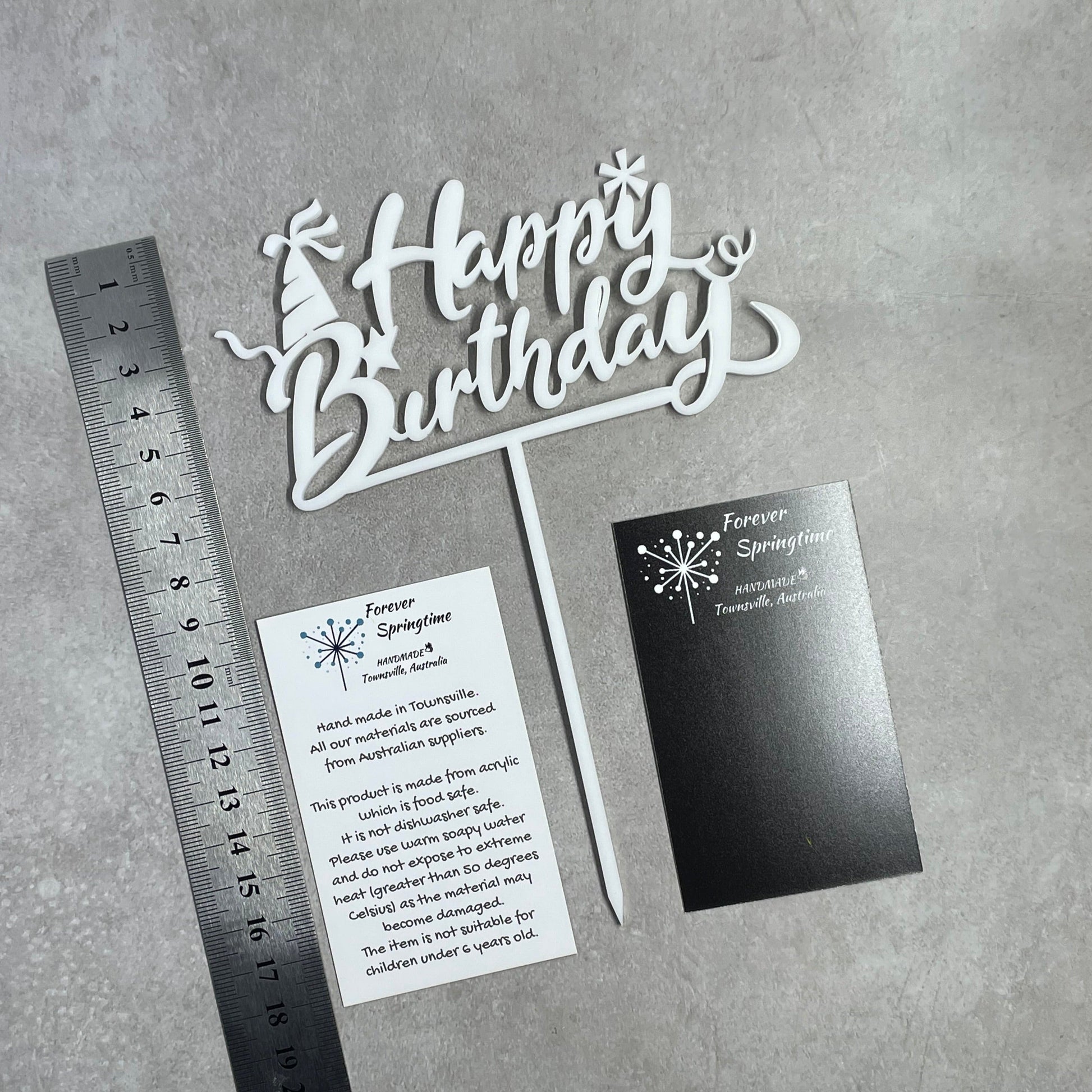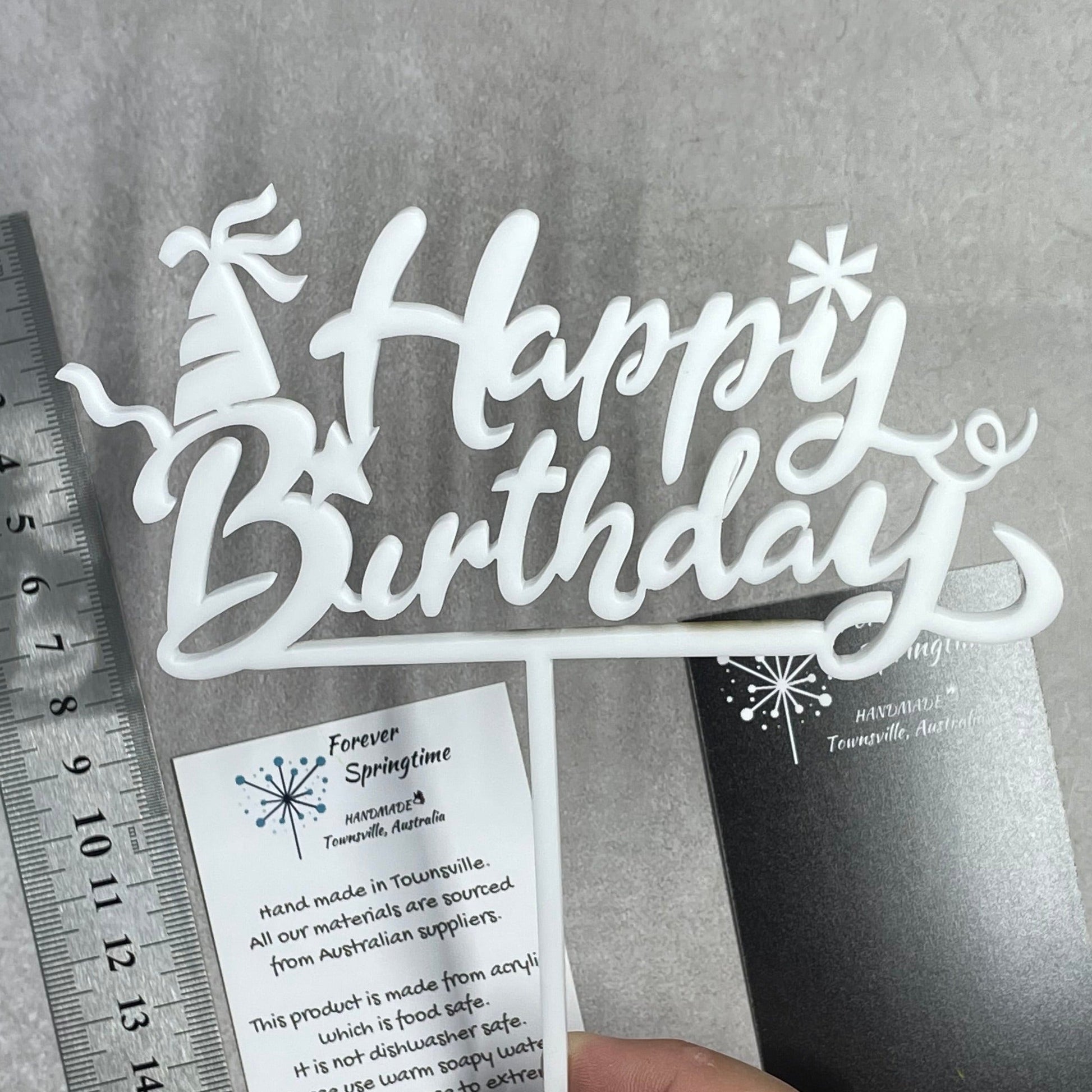 The topper is made from food safe acrylic on a laser at my home in Townsville. The items are food safe. They are not dishwasher safe. Please use warm soapy water only. Please do not expose to extreme heat (greater than 50 degrees Celsius) as the item may become irreparably damaged. They are not suitable for children under 6 years old.